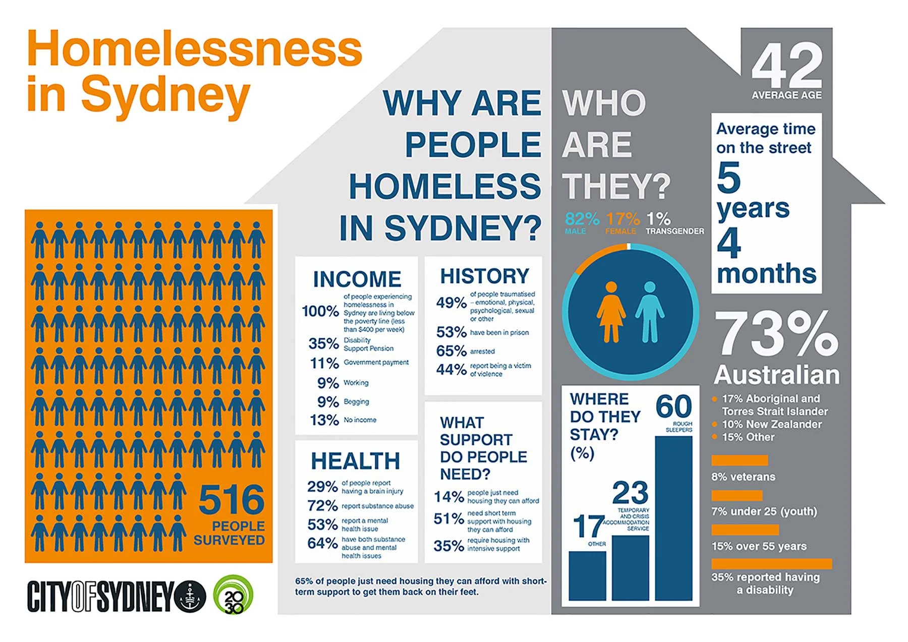 Motivos como violência doméstica, traumas emocionais, vícios e problemas com a polícia fazem com que cada vez mais pessoas se tornem moradores de rua na Australia.